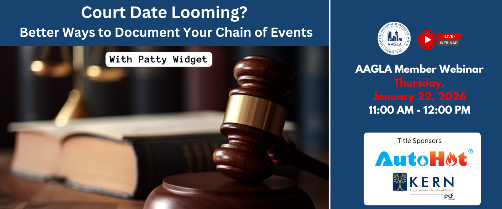 Join us and hear some real-life stories as only told by Patti Widget. This webinar will give you the advice you need to avoid appearing in your own, real-life “Judge Judy” type horror story. Our property management expert, Patti Widget from Widget’s Way, will provide you with the advice you need to adequately get yourself ready to have your winning day in court. Attending this webinar will help you to avoid courtroom situations that can get you into trouble – we guarantee it!