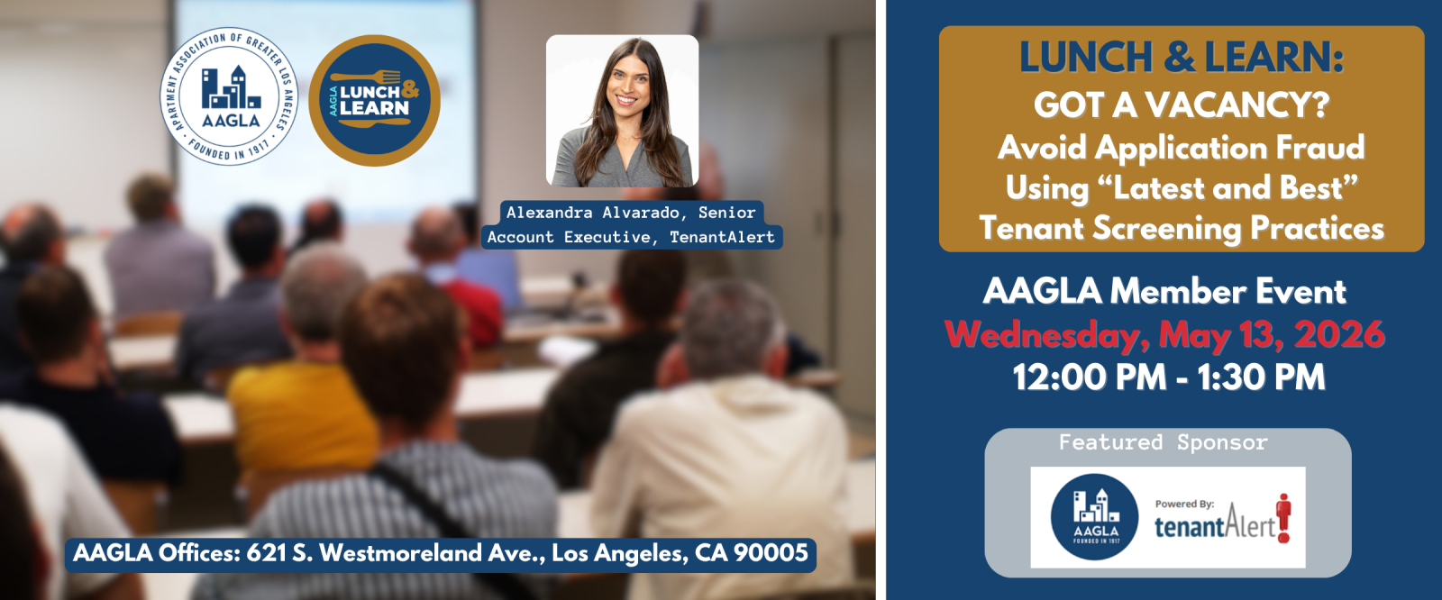 Join for lunch and learn all about the latest updates concerning California tenant applicant screening laws. Also, learn the latest tenant applicant screening strategies so you don’t get stuck with lousy tenants that make you miserable. Screen for the best – we will teach you how. Our expert, Alexandra Alvarado from TenantAlert (a/k/a, AAGLA Screening) joins us for lunch and an informative presentation. She will also be taking your questions as your Q&A drives the discussion.