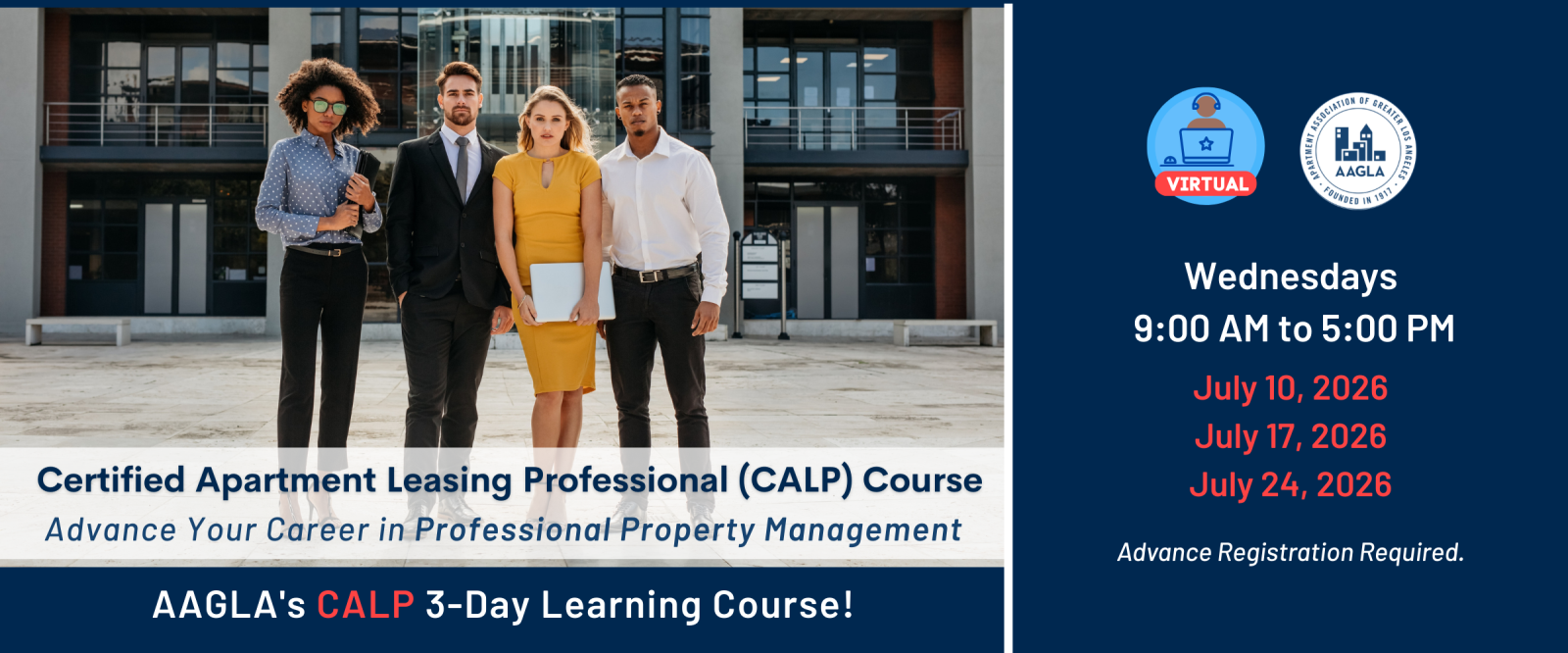 Are you a leasing professional looking to be certified? Are you interested in career advancement or a career change? Advance your career and become a Certified Apartment Leasing Professional (CALP)! The Apartment Association of Greater Los Angeles is offering this comprehensive certification course. Candidates will learn professionalism, teamwork, organization, time management, and technology skills to attract new residents and process leases. Let AAGLA help you advance your career in property management!