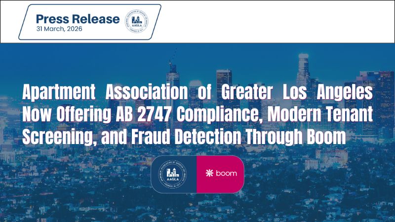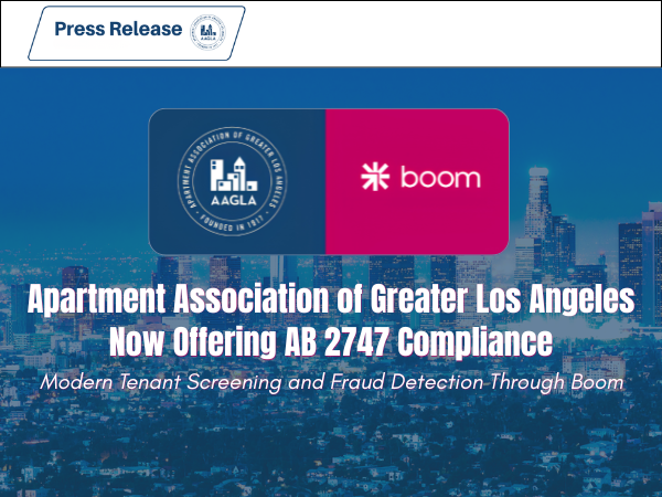 “Los Angeles property managers are navigating a more complex and challenging operating environment than ever—new compliance requirements, rising fraud risk, and residents who expect more from their rental experience,” said Rob Whiting, CEO of Boom. “Our relationship with AAGLA gives members a direct path to tools that address all three. We’re proud to serve this community and excited to help more Southern California operators get compliant, reduce risk, and deliver a better experience to their residents.”